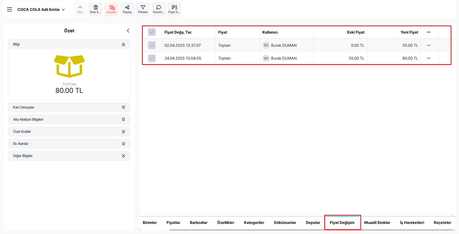 - Eski fiyatlarını görmek istediğiniz stoğun üzerine çift sol tıklayarak stoğun detay sayfasına girin.